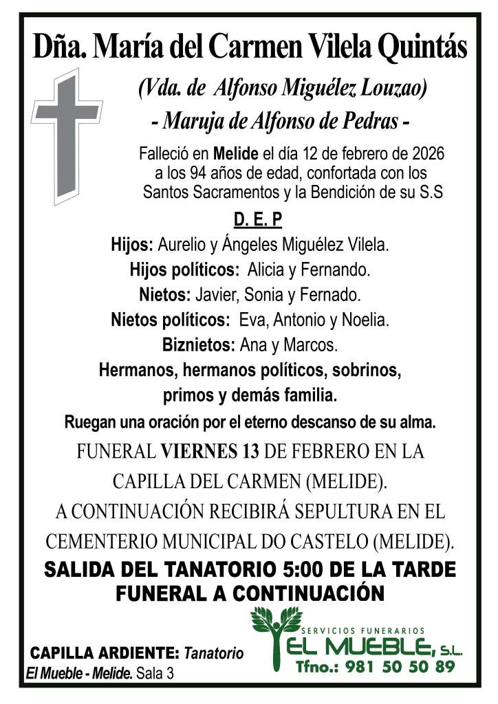 Pésame para la familia de Dña. María del Carmen Vilela Quintás..